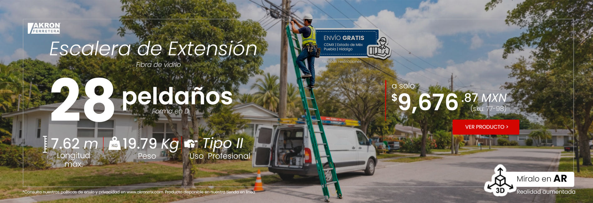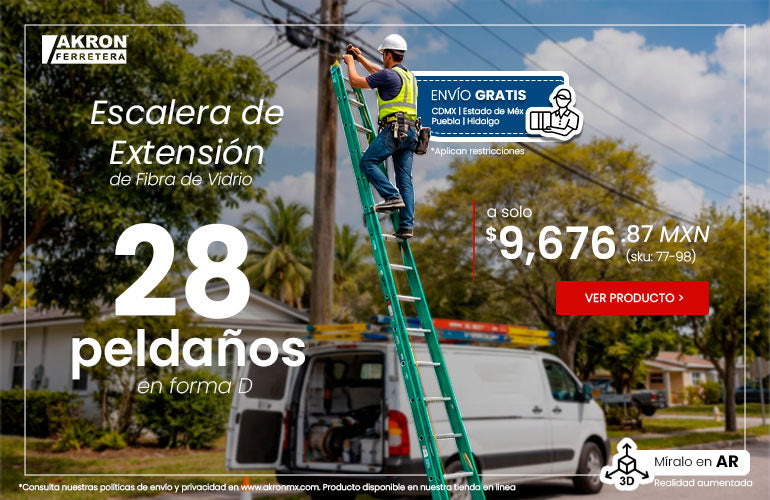 Escalera De Extensión Akron 81-25 | Fibra De Vidrio | 4.27m A 7.62m | 28 Escalones | Uso Industrial Pesado | Tipo lA | Capacidad De Carga 225kg