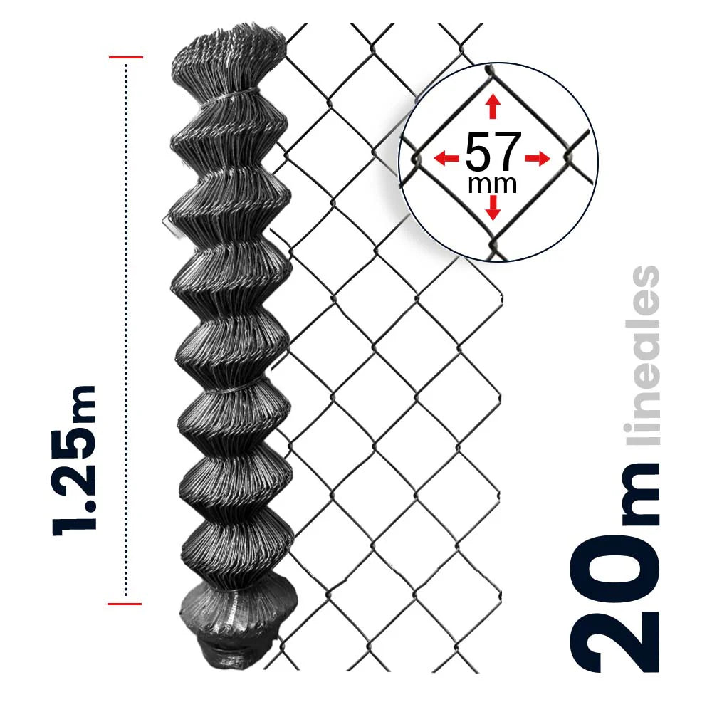 Malla Ciclónica de Acero GalvanizadoAltura: 1.25mAbertura de Rombo: 57mmCalibre: 11Rollo: 20m Lineales
