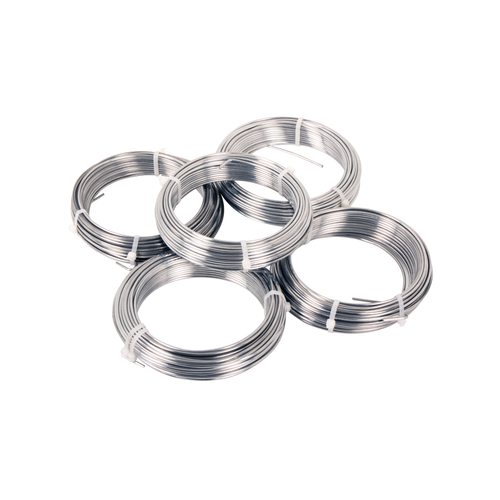 Alambre galvanizado de acero de alta resistencia con recubrimiento de zinc para protección contra la corrosión. Presentación en rollos de 1 kg para fácil uso y transporte.