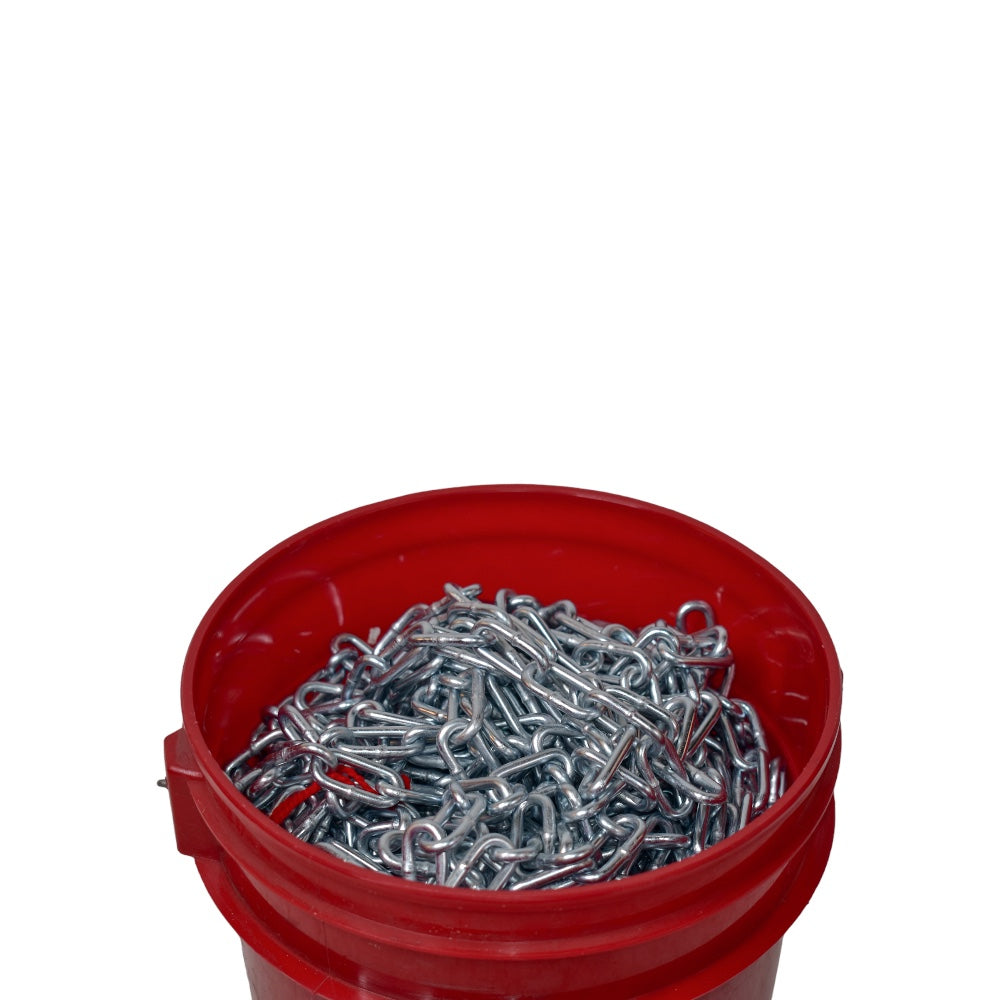 Cadena de acero galvanizado grado 30, electrosoldada, calibre 1/8", presentada en cubeta de 25 kg. Diseñada para aplicaciones generales y de carga ligera a media, con eslabones soldados para mayor resistencia y galvanizado para protección contra la corrosión.