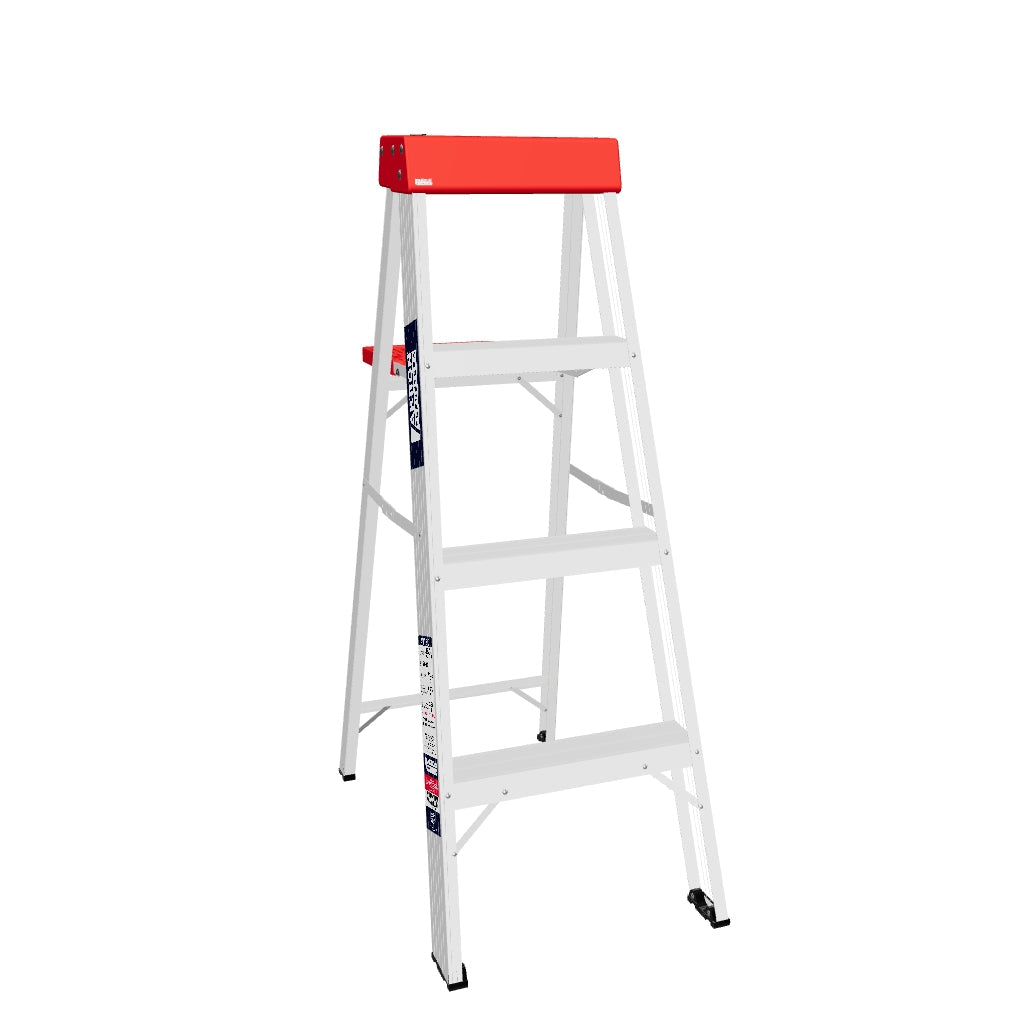 Largueros con perfil de aluminio, escalones planos de aluminio con antideslizante con huella de 7.5cm. Plataforma de plástico (Roja) 32cm. X 13cm. Con ranuras porta herramienta, Porta cubetas de plástico (Roja) 49cm. X 38cm. Y pies de seguridad fabricados con plástico antideslizantes.