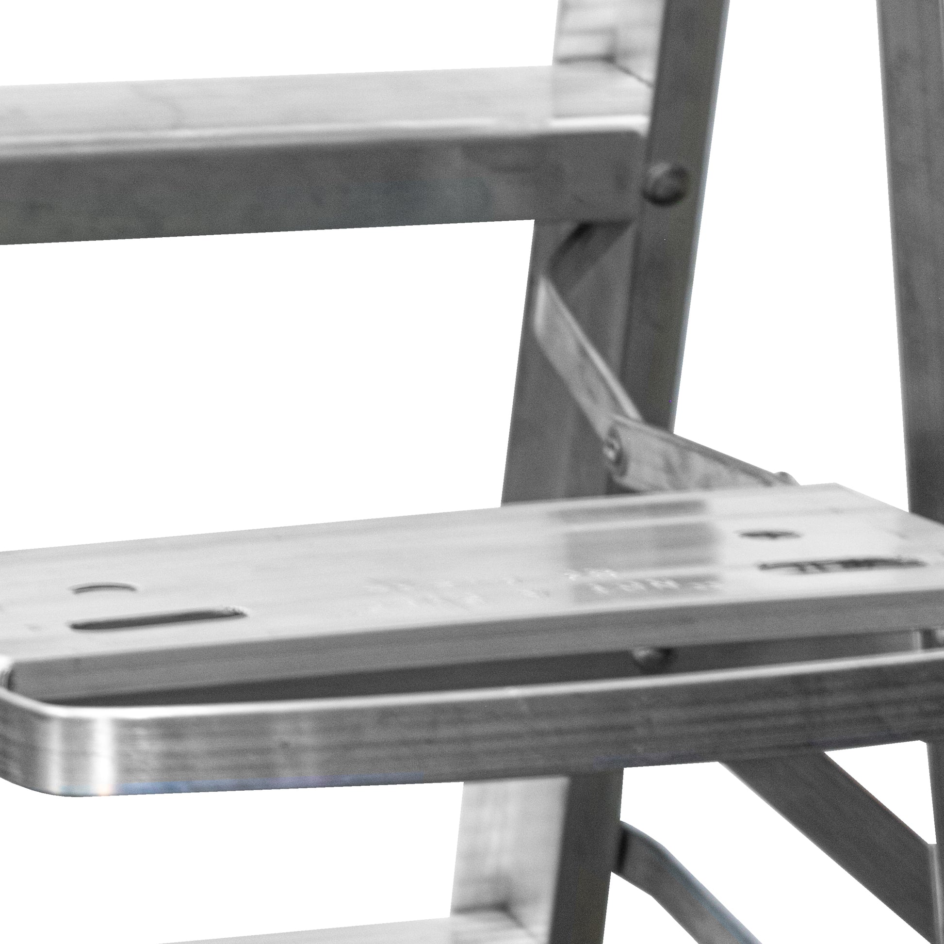 Refuerzos en escalones totalmente fabricados en aluminio para evitar oxidación. Tirantes anti pellizcos y escalones sólo de un lado.