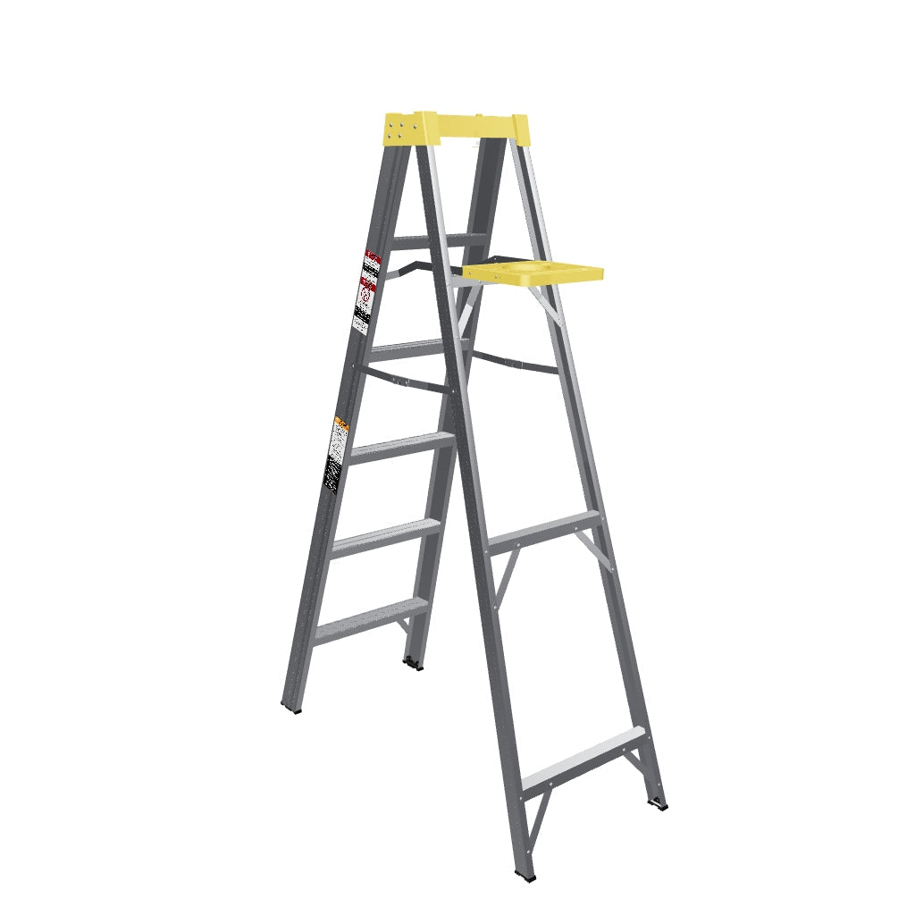 Largueros con perfil de aluminio, escalones planos de aluminio con antideslizante con huella de 7.5cm. Plataforma de plástico (Amarilla) 32cm. X 13cm. Con ranuras porta herramienta, Porta cubetas de plástico (Amarilla) 49cm. X 38cm. Y pies de seguridad fabricados con plástico antideslizantes.