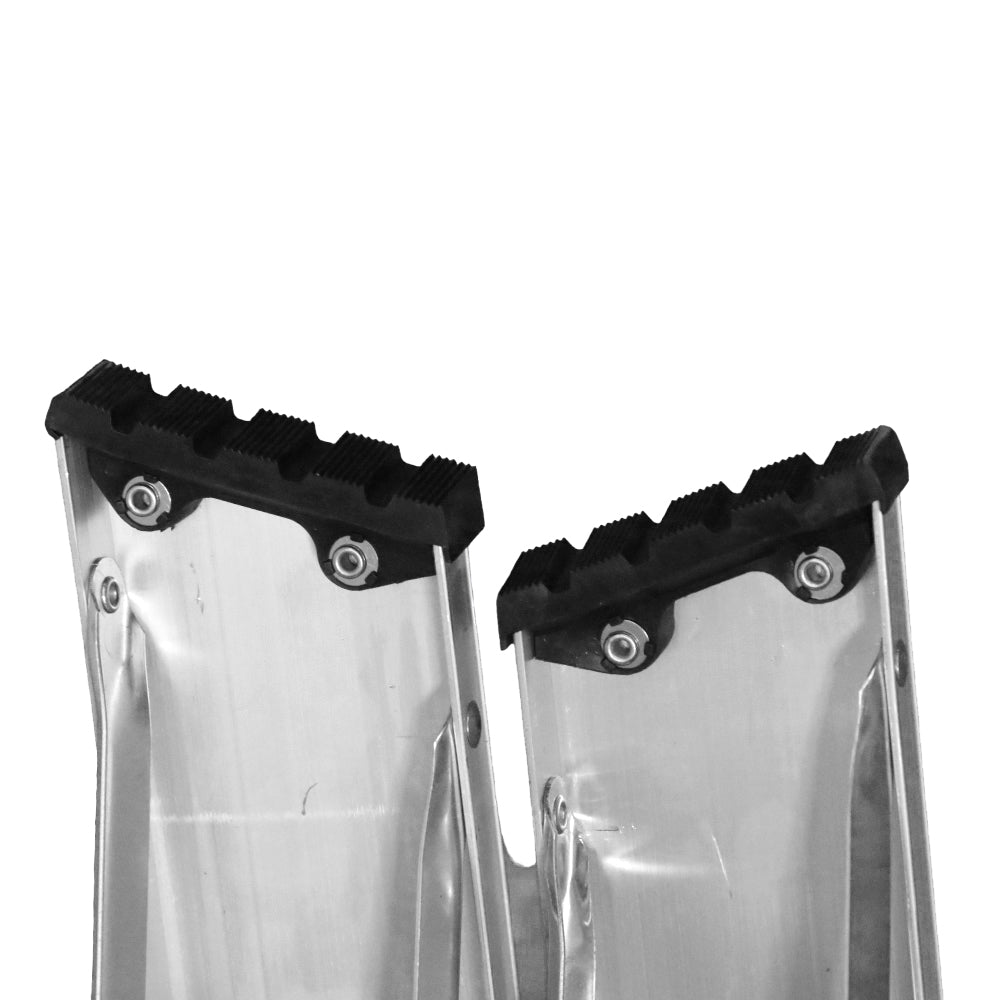 Largueros con perfil de aluminio, escalones planos de aluminio con antideslizante con huella de 7.5cm. Plataforma de Aluminio 32cm. X 13cm. Y pies de seguridad fabricados con plástico antideslizantes.