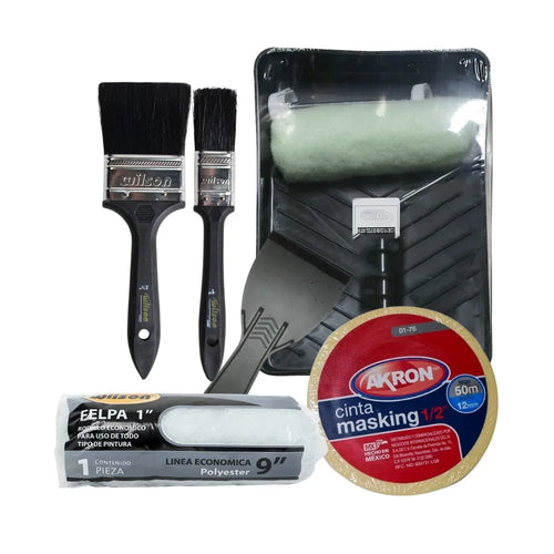 1 Charola, 1 Rodillo de felpa, 1 Repuesto de rodillo, 1 Maskin 1/2", 1 Brocha 1", 1 Brocha 2 1/2", 1 Espátula.- Marca: Wilson