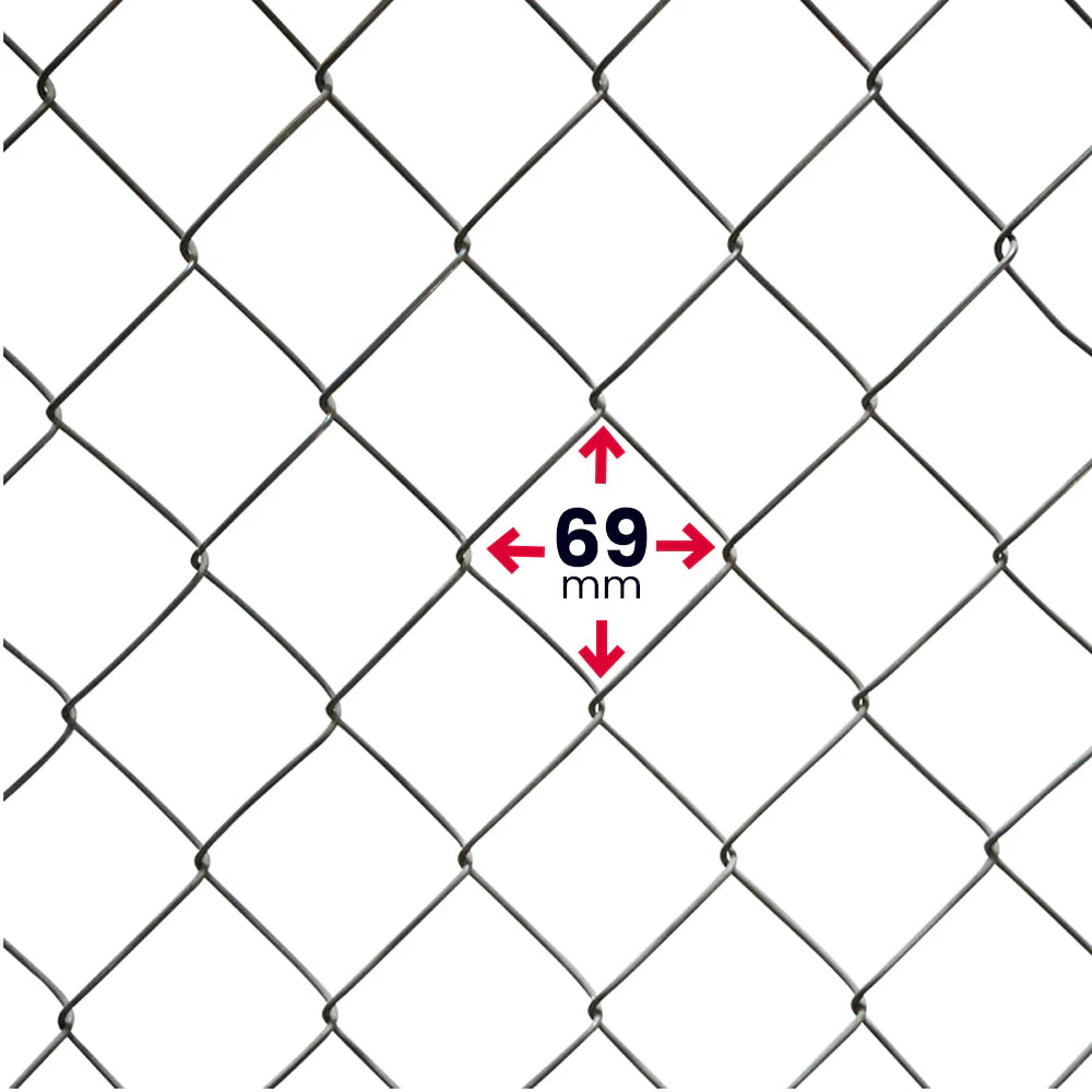 Malla ciclónica de uso general para cercado de perímetros, protección de áreas, separación de espacios y aplicaciones agrícolas e industriales. Fabricada con alambre de calibre 12.5 y abertura de 69 mm, proporciona buena resistencia mecánica y visibilidad.